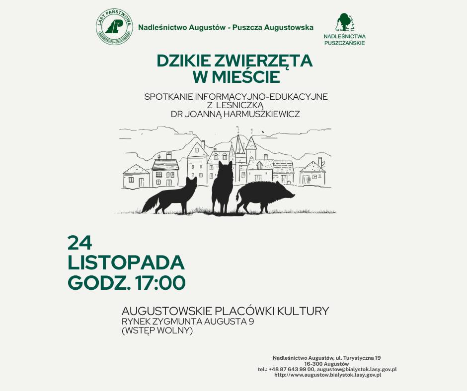 Dzikie zwierzęta w mieście – spotkanie informacyjno – edukacyjne. Zapraszamy na spotkanie informacyjno-edukacyjne!  Już 24 listopada (poniedziałek) o godz. 17:00 zapraszamy Państwa do sali widowiskowej Augustowskich Placówek Kultury na spotkanie poświęcone fascynującemu, ale i ważnemu tematowi dzikiej fauny w przestrzeni miejskiej. Wstęp wolny.