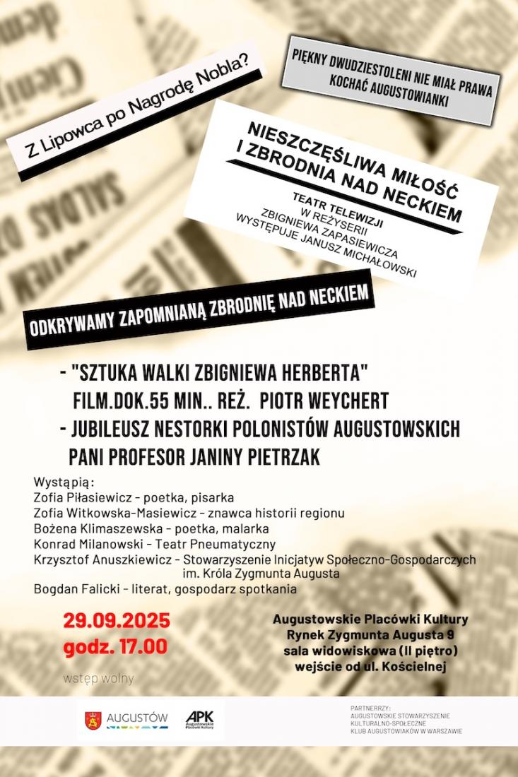 Jubileusz nestorki polonistów augustowskich Pani Profesor Janiny Pietrzak oraz pokaz filmu „Sztuka walki Zbigniewa Herberta” (reż. Piotr Weychert, 55 min.)