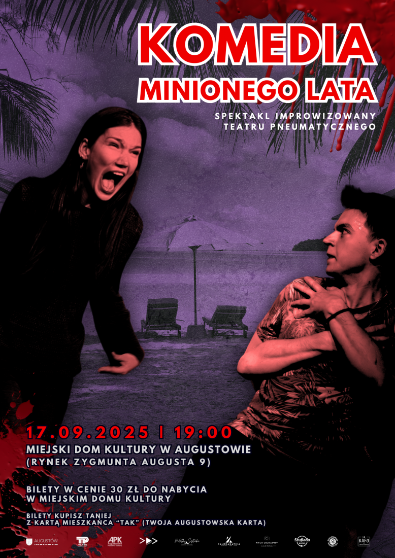 Augustowskie Placówki Kultury i Teatr Pneumatyczny serdecznie zapraszają na pierwszy powakacyjny wieczór gier improwizowanych. W środę 17 września 2025 roku o godz. 19:00 w Sali widowiskowej MDK (Rynek Zygmunta Augusta 9, wejście od ul. Kościelnej, II piętro) Pneumatycy zagrają „Komedię minionego lata”!
