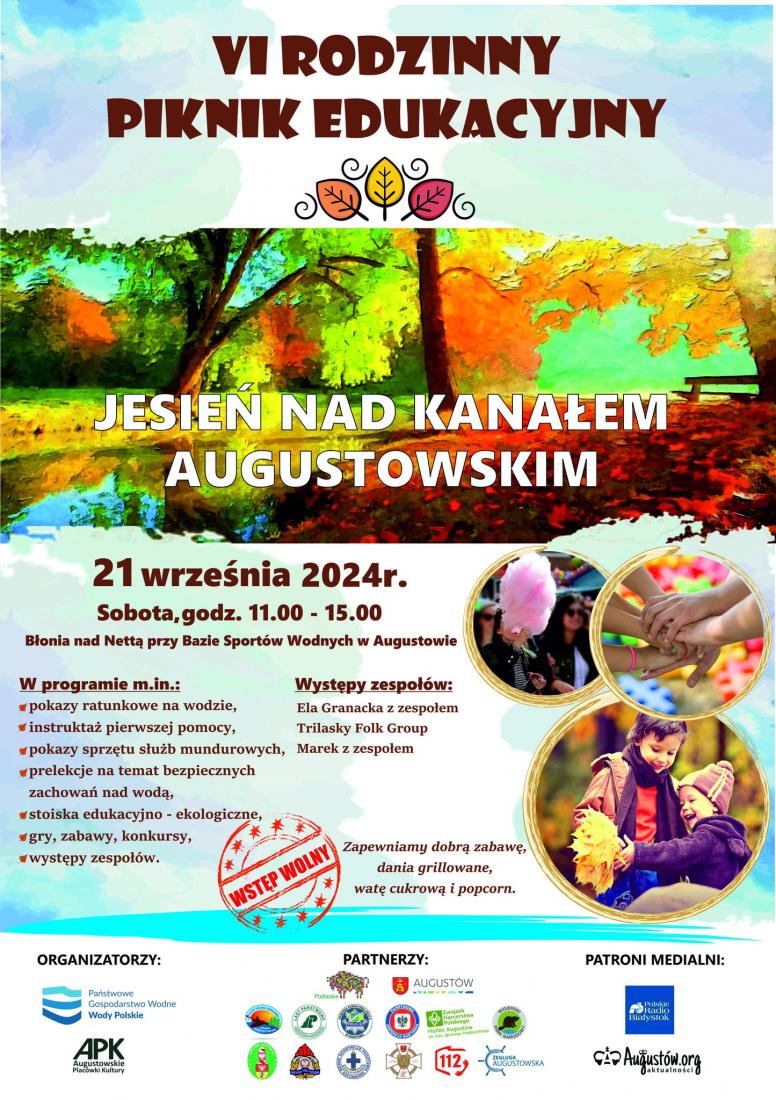 plakat Regionalny Zarząd Gospodarki Wodnej w Białymstoku serdecznie zaprasza na VI Piknik Edukacyjny „Jesień nad Kanałem Augustowskim”. Wydarzenie odbędzie się 21 września na Błoniach nad rzeką Nettą przy Bazie Sportów Wodnych w Augustowie.  Na piknik zapraszamy zarówno dzieci jak i dorosłych, każdy z pewnością znajdzie coś interesującego, gdyż na wszystkich uczestników pikniku czekać będzie moc atrakcji. Będzie to zarówno edukacja w formie zabawy i ciekawych spotkań, ale także występy zespołów, pokaz sprzę
