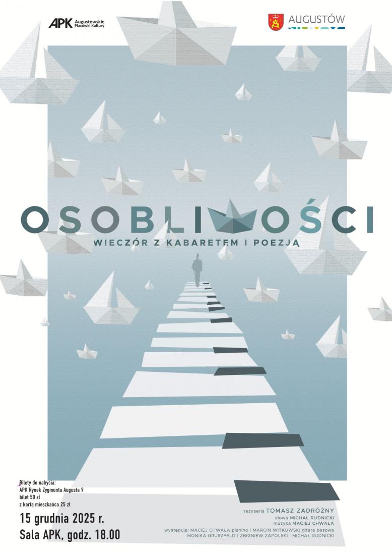 Augustowskie Placówki Kultury serdecznie zapraszają w poniedziałek 15 grudnia 2025 o godz. 18:00 do Sali widowiskowej MDK (Rynek Zygmunta Augusta 9, wejście od ul. Kościelnej, II piętro) na spektakl „Osobliwości – Wieczór z Kabaretem i Poezją”.