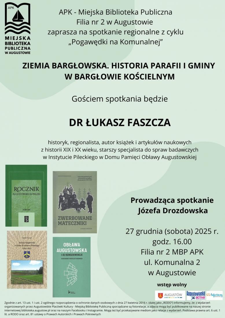APK - Miejska Biblioteka Publiczna Filia nr 2 w Augustowie zaprasza 27 grudnia (sobota) o godz. 16.00 na spotkanie regionalne z cyklu "Pogawędki na Komunalnej" - "ZIEMIA BARGŁOWSKA. HISTORIA PARAFII I GMINY W BARGŁOWIE KOŚCIELNYM".