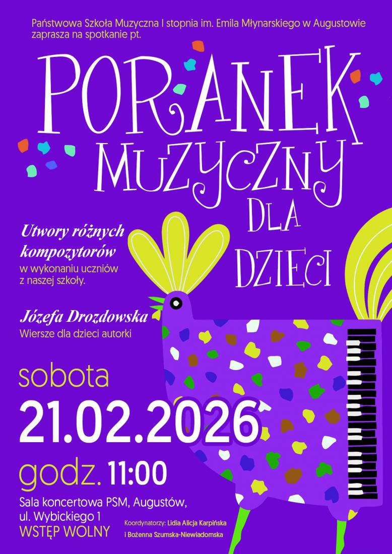 Państwowa Szkoła Muzyczna I stopnia im. Emila Młynarskiego w Augustowie zaprasza na "Poranek Muzyczny dla dzieci".Szczegóły na plakacie.