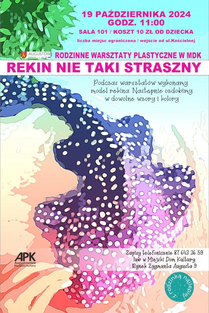 Już w sobotę 19 października 2024 w pracowni nr 101 w Miejskim Domu Kultury w Augustowie (Rynek Zygmunta Augusta 9) o godz. 11:00 odbędą się rodzinne warsztaty plastyczne pt. „Rekin nie taki straszny”, podczas których młodzi adepci sztuk plastycznych z pomocą opiekunów będą tworzyć tego drapieżnika morskich głębin, który dzięki uczestnikom zajęć stanie się przyjazną, bardzo kolorową rybką!