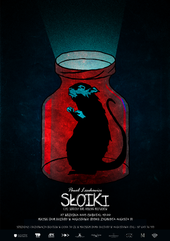 W imieniu działającego przy Augustowskich Placówkach Kultury Teatru Pneumatycznego zapraszamy 27wrześni 2025 o godz. 19:00 do sali widowiskowej Miejskiego Domu Kultury (Rynek Zygmunta Augusta 9, wejście od ul. Kościelnej, II piętro) na spektakl pt. „Słoiki, czyli skrócony kurs robienia przetworów” w reżyserii Pawła Leszkowicza.